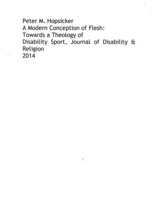 Peter M. Hopsicker (2014) A Modern Conception of Flesh: Towards a Theology ofDisability Sport, Journal of Disability & Religion, 18:1, 82-96, DOI: 10.1080/15228967.2014.868986
